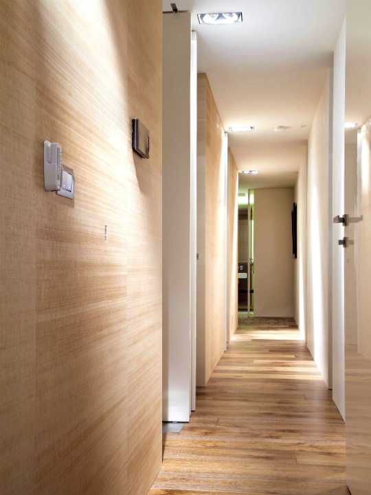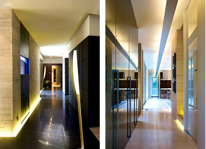 Un pavimento lucido in uno spazio piuttosto modesto come un corridoio implica fin dall'inizio, un'attenzione in più nella gestione delle superfici lucide. Potrebbero essere ancora presenti alcuni elementi cromati, ma una parete lucida, se presente, dovrà essere ben bilanciata in termini di luce. Non dobbiamo illuminare completamente questa parete di marmo lucido, ad esempio, ma dovremo giocare con delicati fasci di luce. Considerando lo spazio modesto, crediamo che un pavimento lucido possa essere associato a un muro in pietra naturale dello stesso colore ma con una texture diversa, ad esempio spliface.
