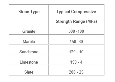 La resistenza alla pressione (generalmente chiamata "resistenza") è indicata con MPa e descrive la forza minima richiesta alla quale la pietra si rompe sotto pressione o flessione (instabilità).