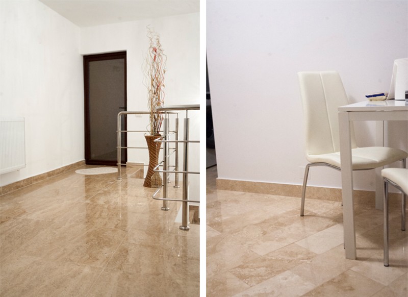 Uno zoccolo dello stesso colore della parete è un investimento esteticamente inutile, perché non si distinguerà dalla parete, ma resta comunque un bene per proteggere la parete dai danni, come abbiamo già detto. Illustriamo due possibilità con una parete bianca come riferimento: 1) un pavimento in Travertino Classico abbinato a un plinto dello stesso materiale (sottolinea la continuità) oppure 2) un pavimento in Travertino Classico è associato a travertino Latte (delimitazione cromatica leggera).