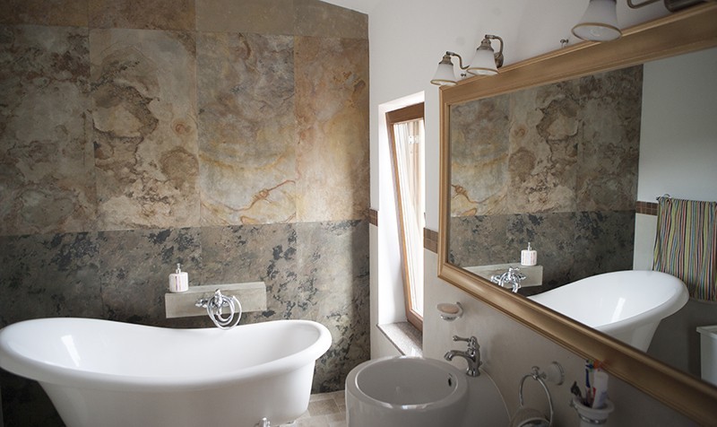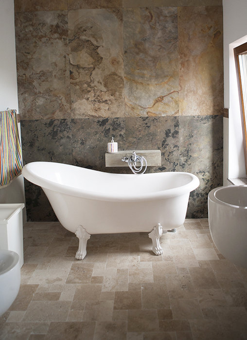 La vasca dallo stile classico si sposa perfettamente con l'aspetto naturale dell'ardesia, i sanitari sono stati scelti in linee più moderne e il grande specchio, con cornici dorate, trasmette una sensazione di spazio esteso. Interessante anche la disposizione delle finestre: la luce naturale mette perfettamente in risalto le sfumature del muro decorativo in pietra naturale.