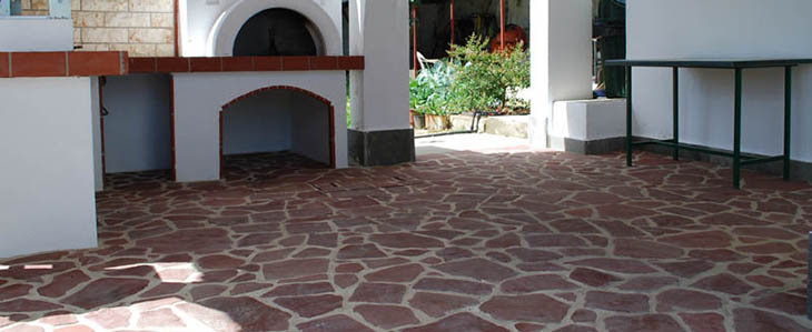 Base della casa e camminamento esterno, rivestiti con ardesia poligonale Sikis