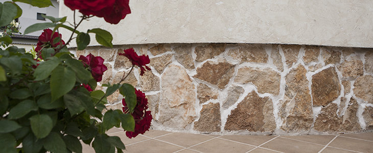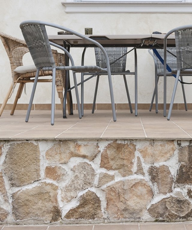 L'immagine successiva presenta un altro esempio per l'utilizzo di lastre poligonali all'esterno: Calcare poligonale crema Macedonia , di medie dimensioni, utilizzato per il rivestimento di pareti di terrazze. La pietra scelta per la pavimentazione (travertino classico) ha le stesse tonalità.