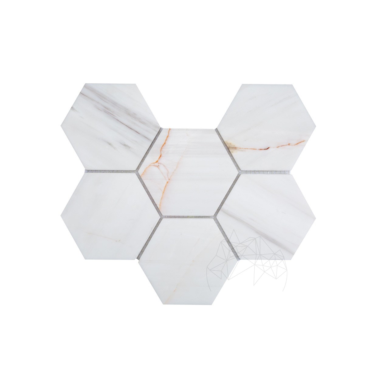 In conclusione, il mosaico in marmo lucido "Calacatta Amber", con la sua forma esagonale e le sottili venature dorate, è la scelta ideale per chi desidera portare un tocco di eleganza, raffinatezza e lusso nella propria casa. Ogni pezzo di mosaico è un'opera d'arte in sé, capace di trasformare qualsiasi spazio in un ambiente sofisticato e glamour.