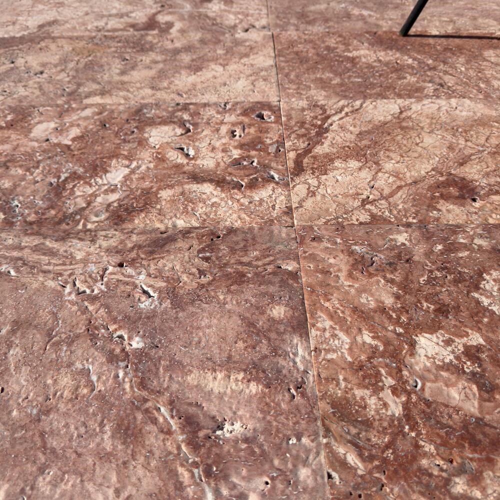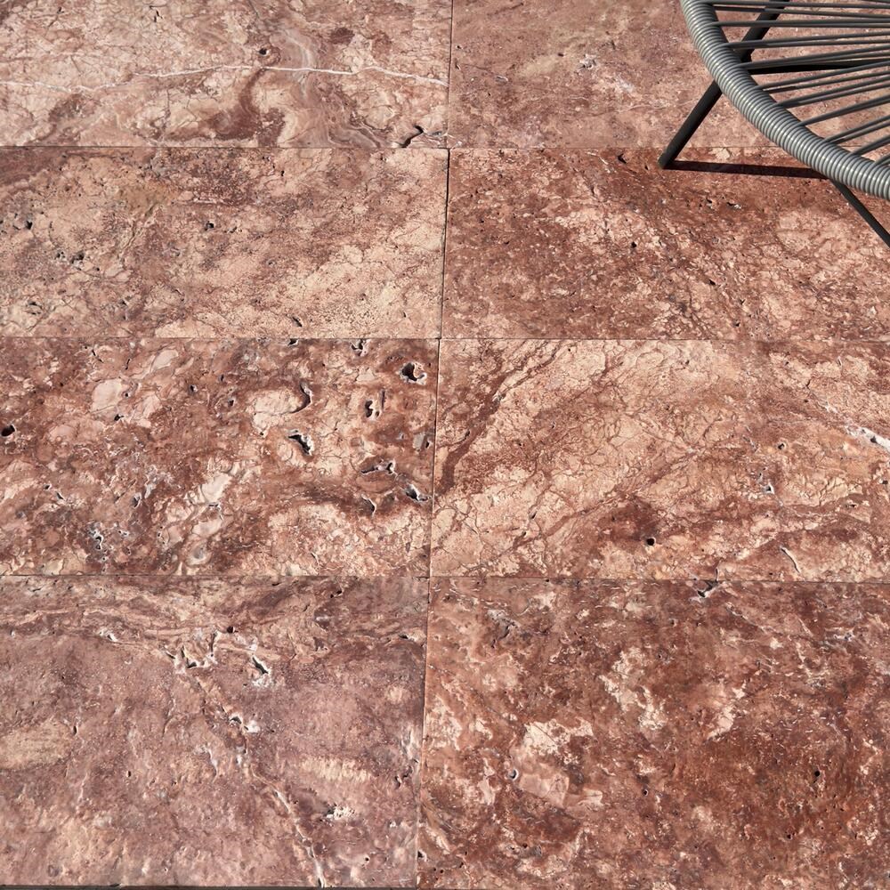 Le piastrelle in travertino rosso oppio vengono posate utilizzando la tecnologia "a pettinatura".