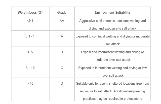 There is a test, especially for sandstone, where the stone is immersed in salt water, then dried in the oven. The stone is subjected to this cycle 15 times. The amount of eroded stone is weighed, resulting in a percentage of the residue that the stone loses from these cycles. The weight loss percentage of the tile subjected to the test is based on the estimates in the table below: